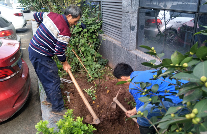 ????? ?公司為進(jìn)一步給員工提供更宜人舒適的工作環(huán)境,除公司各處現(xiàn)均有綠植外,又購(gòu)回十余棵桂花樹(shù)栽種于公司門(mén)前。圖為大家共同栽種和種好后場(chǎng)景。